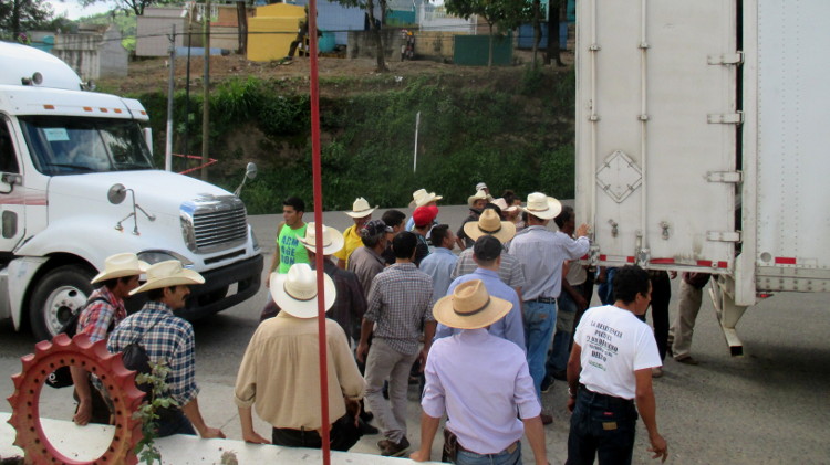 Members of the regional mining resistance movement inspect a truck at a roadside action in Casillas to make sure it does not carry material or supplies destined for the Escobal mine. Sandra Cuffe