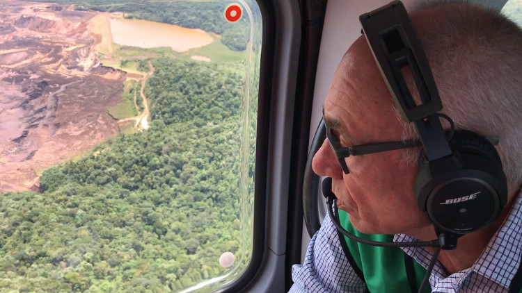 Vale CEO Fabio Schvartsman in a helicopter over the site of the Jan. 25 Córrego de Feijão tailings dam collapse. Courtesy of Vale