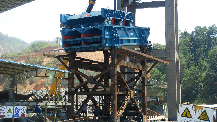 The two-mass vibrating screen from General Kinematics, shown here being installed in China, is designed to handle higher thoughput without needing more power or space. Courtesy of General Kinematics