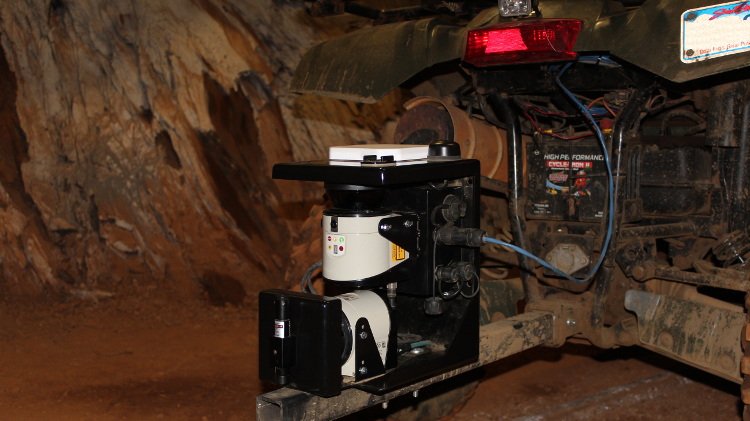 Peck Tech’s uGPS Rapid Mapper is mounted on a vehicle and emits infrared beams upward and outward as it is driven through mine tunnels, collecting data it will use to create a 3D point-cloud model. Courtesy of Peck Tech Consulting