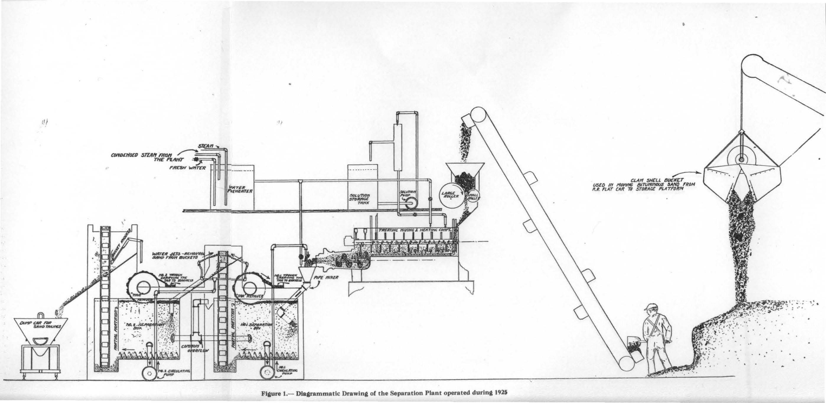 This drawing, originally published in the 1929 CIM Bulletin article “The Separation of the Bitumen from Alberta Bituminous Sands” by Karl Clark, depicts a hot water separation plant as it was configured in 1925 at a test site in Edmonton.