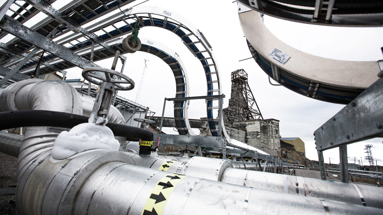 The C-Shaft headframe at the Giant mine near Yellowknife is framed by piping used in a freeze optimization study that helped determine how the mine’s arsenic trioxide dust would be stored for the next hundred years | Dave Brosha Photography/AANDC
