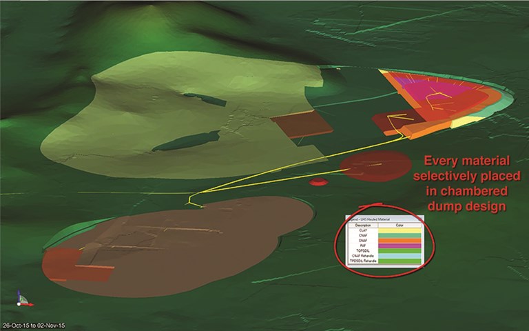 During a CIMVTL-21 presentation attendees were shown how to use the Deswik.Enviro landform engineering tool suite to perform haulage modelling based on an operating dump design. Users can model, schedule and cost the reshaping to a stable final landform design for closure as part of each design iteration. Courtesy of Deswik