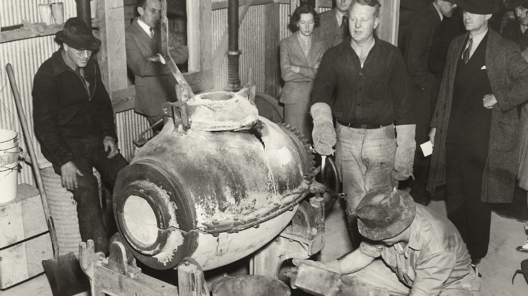 After the 1908 explosion that destroyed the mill, the mine operated from 1932 to 1942 until President Roosevelt suspended gold mining when the country joined WWII. Pictured is a gold pour in March 1938. Courtesy of OceanaGold