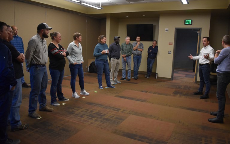 Orla Mining CEO and president Jason Simpson (second from right) speaks to a group of employees during one of the company’s leadership workshops. Courtesy of Orla Mining