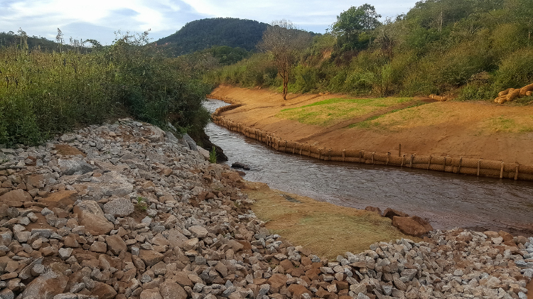 Revegetation and erosion control at the Santarem River, as seen in this June 2017 photo, is underway to remediate the area after the 2015 Fundão tailings dam failure. Courtesy of BHP