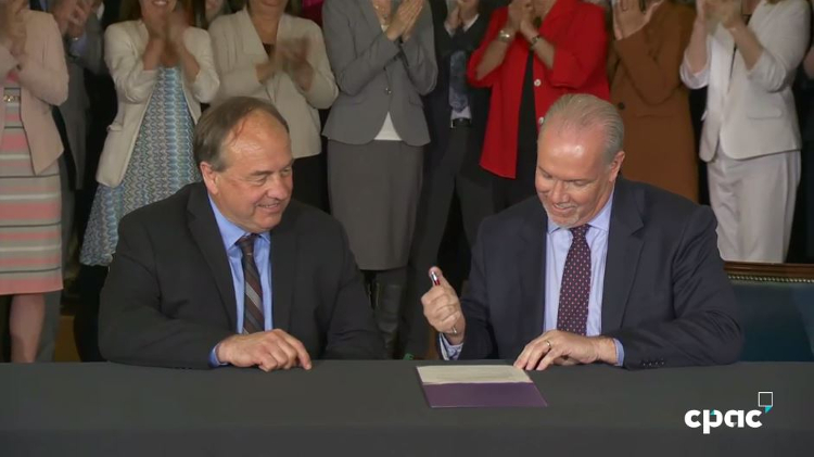 B.C. Green Party leader Andrew Weaver and NDP leader John Horgan signed a co-operation plan on May 30 to form the province's first minority government in 65 years. Screencap from CPAC