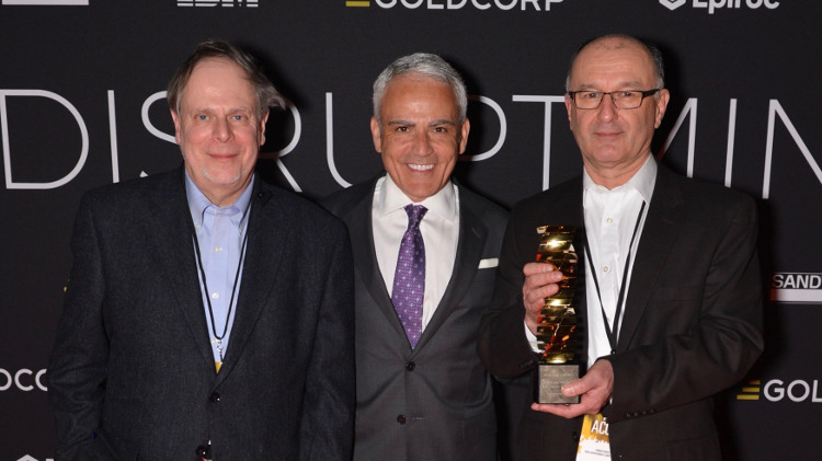Goldcorp CEO David Garofalo poses with the Acoustic Zoom team, CEO Jacques Guigné (left) and vice-president of marketing Gary Dinn (right). Courtesy of Disrupt Mining