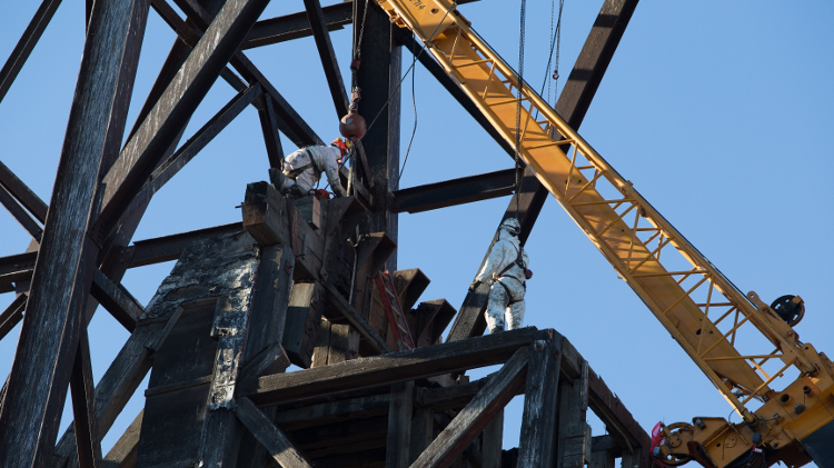 Workers on Giant Mine's C-Shaft head frame in Octobert 2015. The federal government named Parsons the construction manager of the Giant mine remediation project. Courtesy of Indigenous and Northern Affairs Canada