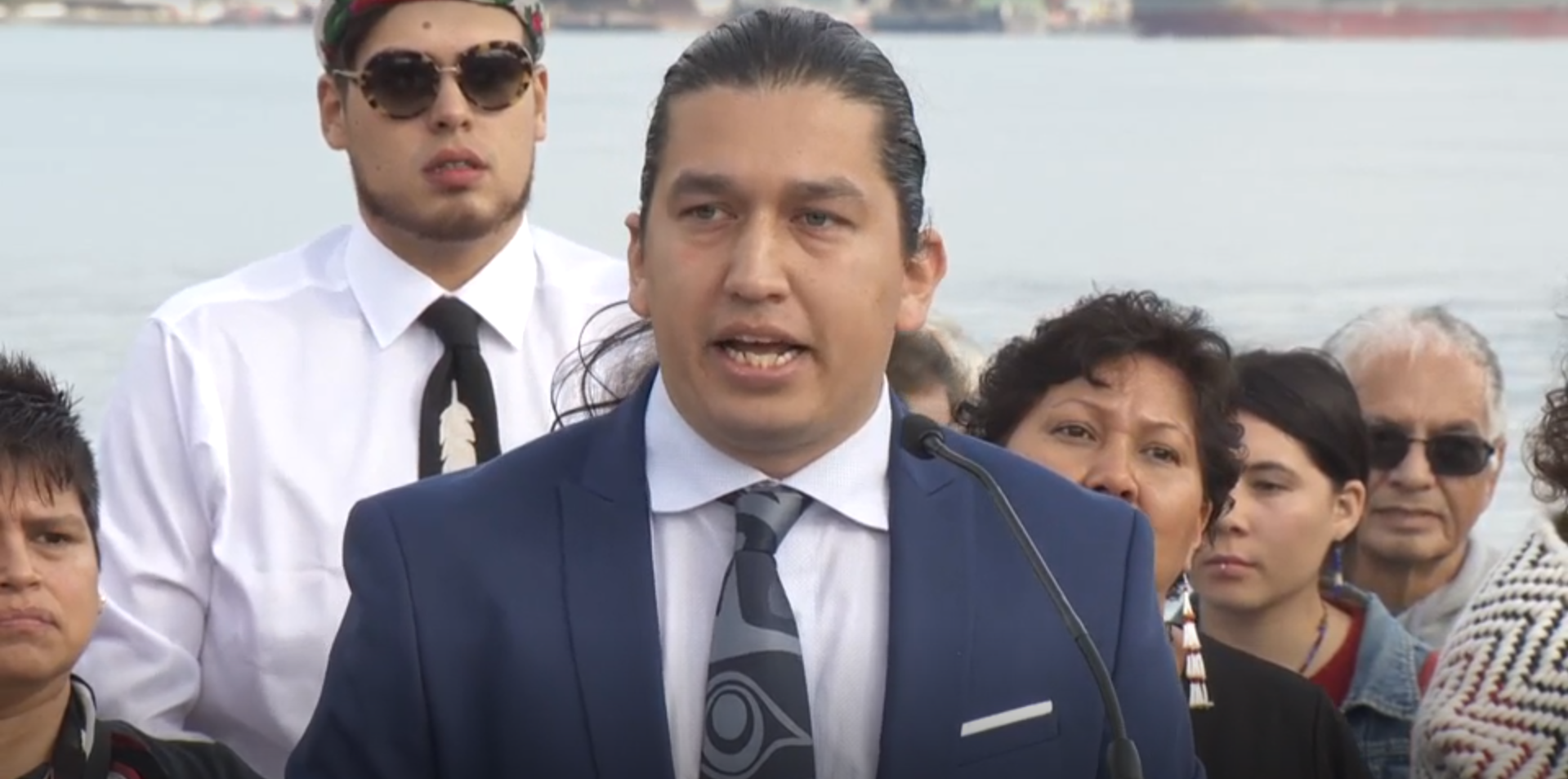 Khelsilem, a Squamish Nation councilor and spokesperson, at a Vancouver press conference on Aug. 30. Screencap courtesy of CPAC