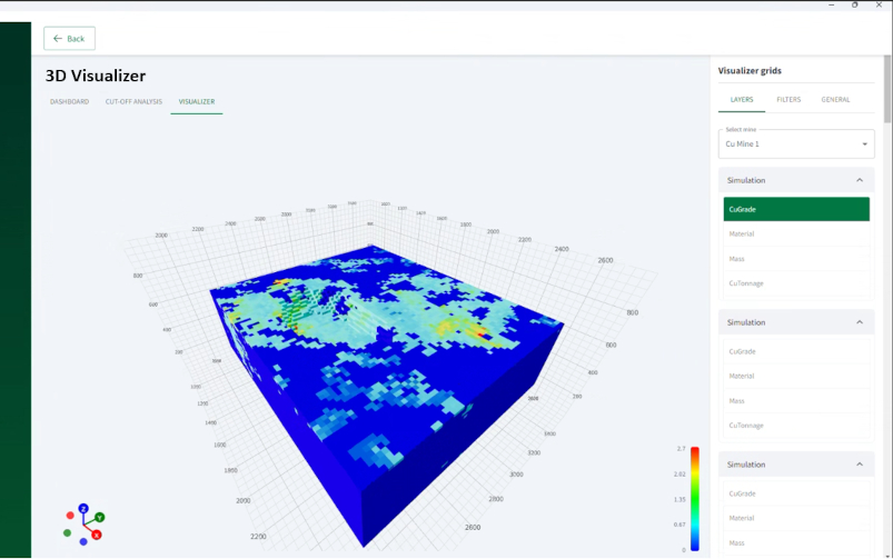 The KPI-COSMO Stochastic Mining Optimizer focuses on geostatistically modelling ore bodies. Courtesy of COSMO