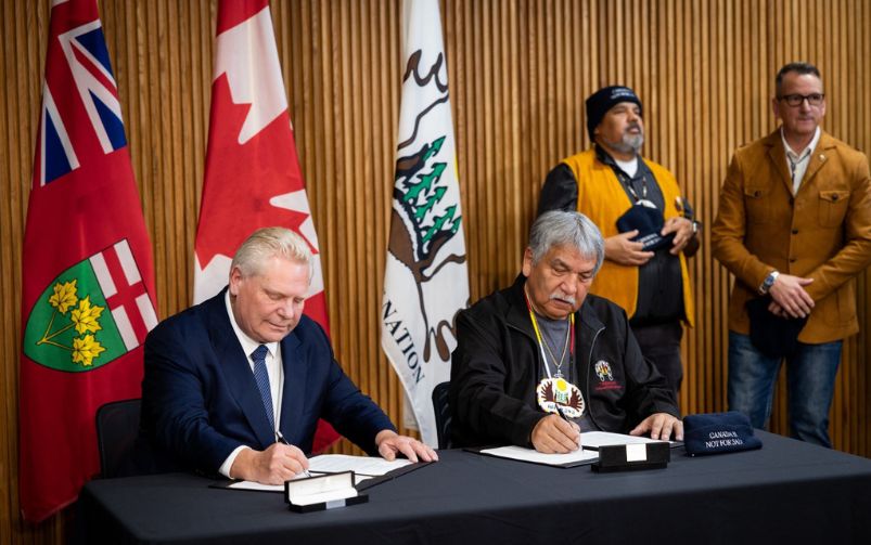 Ontario Premier Doug Ford and Aroland First Nation Chief Sonny Gagnon inked the agreement on Jan. 28. Gagnon expressed excitement about infrastructure improvements for his community at the press conference. Courtesy of Doug Ford via LinkedIn.