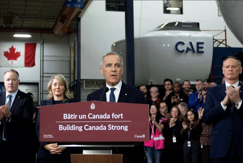 Prime Minister Mark Carney unveiled Canada’s new Defence Industrial Strategy on Feb. 17 at CAE’s flight simulator manufacturing facility and pilot training centre in Montreal, Quebec. Courtesy of Mark Carney via LinkedIn.