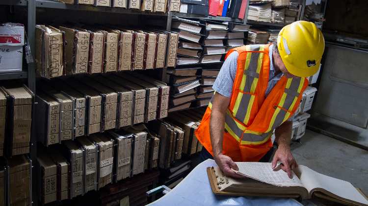 François Chabot, directeur opérations et ingénierie à Integra, examine l’une des nombreuses documents abandonnées par les précédents propriétaires de la mine Sigma. Derrière lui sont entreposées les archives papier de chacun des trous forés sur la propriété depuis 1939. Valerian Mazataud