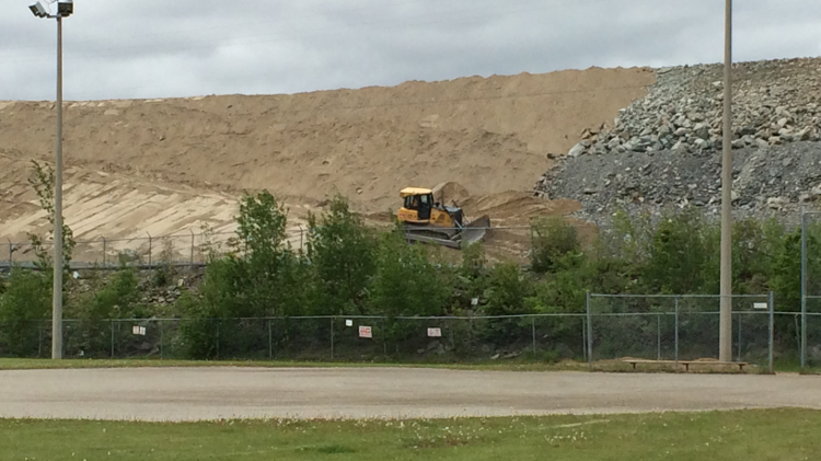Le talus de roches et de terre entourant la mine est au cœur des efforts de la société visant à limiter l'impact des activités minières sur les résidants de la ville. Durant la construction du talus, les activités avaient lieu entre 7h et 19h | Avec l'aimable autorisation de Porcupine Gold Mines